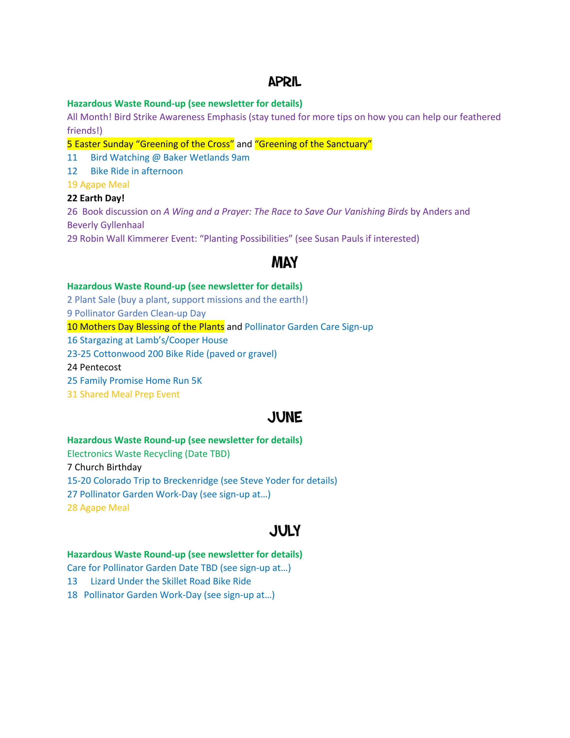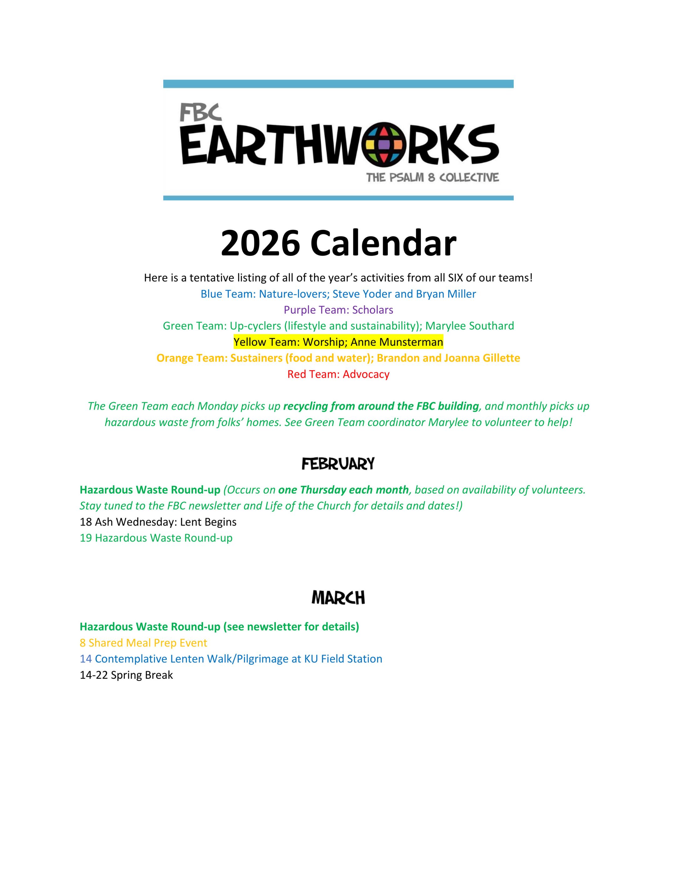 Earthworks Activities Calendar