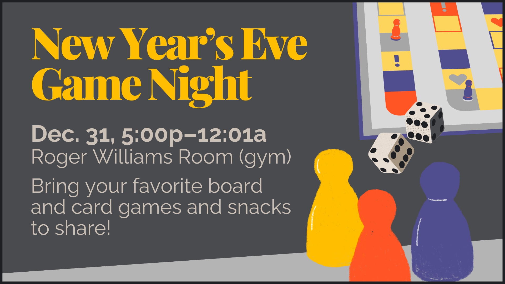 Bring your favorite board and card games, and a snack or beverage (soda pop, fizzy water, etc.) if you can, and join the fun as we play games and ring in the New Year together! You'll find us in the Roger Williams Room (gym). All ages are welcome! |
