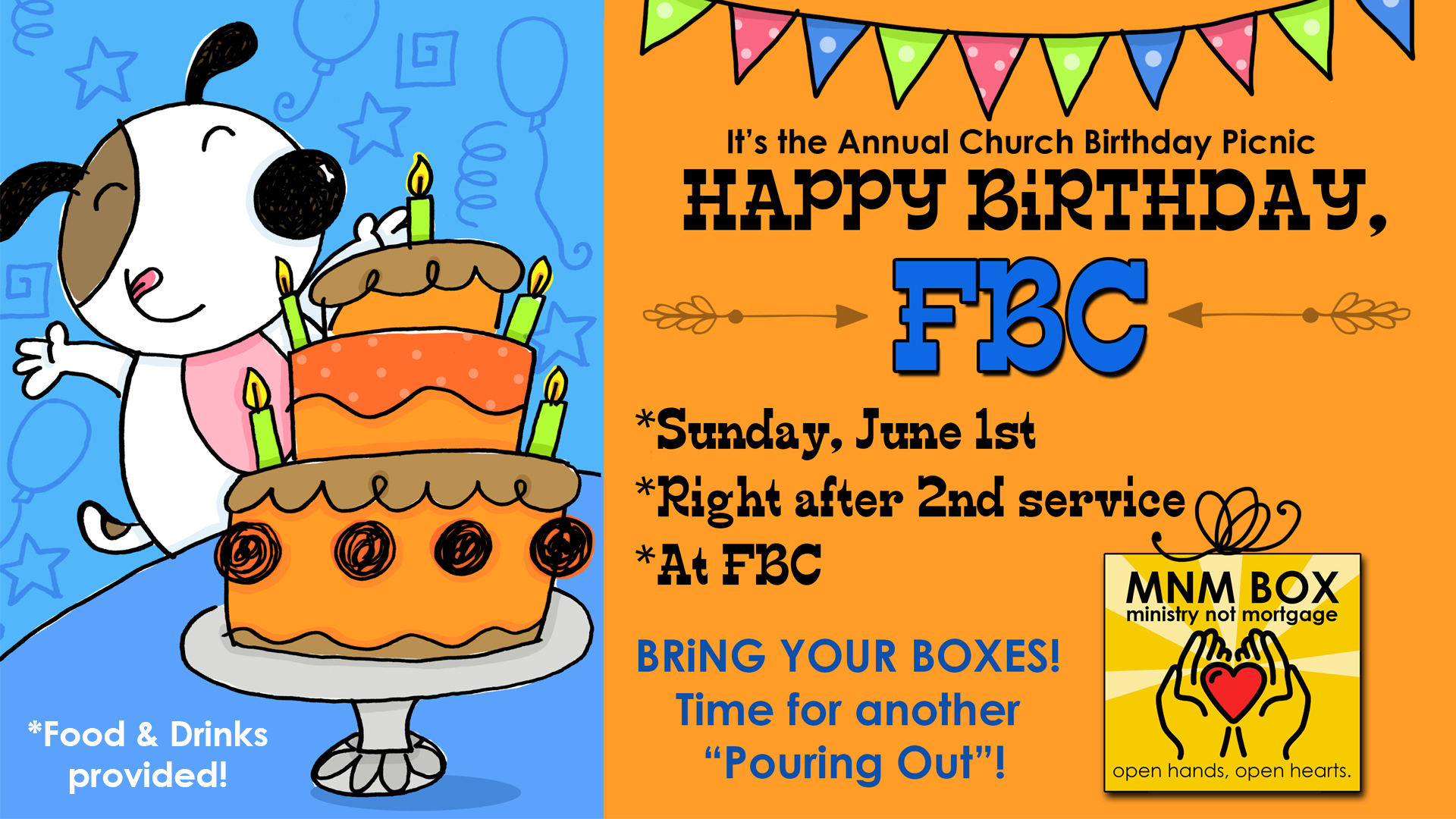 Happy birthday, FBC! Join us for a birthday celebration picnic on the FBC grounds! Food and drinks (and cake, of course) provided. Remember to bring your Ministry not Mortgage boxes to pour out into the container! The Two-Way Sermon Discussion is just that—an opportunity to discuss the past Sunday’s sermon with Pastor Matt. Pastor Matt provides his sermon manuscript for all to peruse as we talk about the parts that are most salient and meaningful for each of us. The last fifteen minutes is spent reading and discussing the scripture for […] |