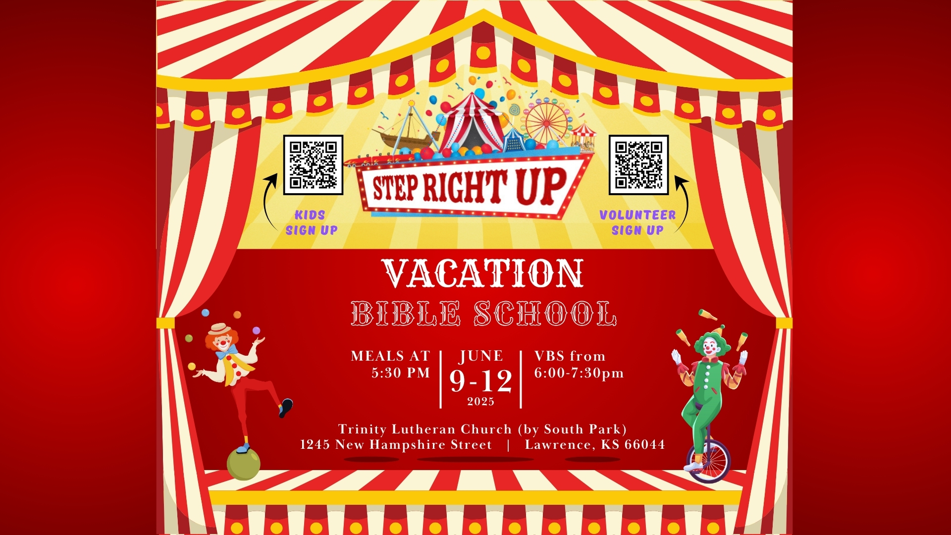 Meal at 5:30 pm, VBS starts at 6:00! Once again, we are partnering with Trinity Lutheran and Plymouth Congregational for Vacation Bible School, June 9–12th! Kids ages 4 through finishing 5th grade are welcome to attend. See details and register at https://firstbaptistlawrence.com/vbs/! |